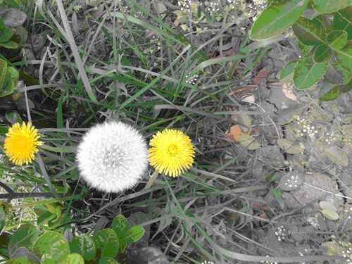 当你们看到这三朵同时绽放的蒲公英花时,您会想到什么?位于中间,豪放得开放着、顶着一头毛绒绒的像棉絮样的花儿,那是蒲公英的种子,伴随春风的吹拂飘洒在大地母亲的任意角落,都会成为明年绿芽儿的根基,足见生命力的顽强;而左右两旁争芳斗艳的黄色花儿,就像是白色花儿的左膀右臂,在保护着它们的姐姐,保护着蒲公英的果实,有了她们的捍卫与衬托,使中间的蒲公英花看上去臃容华贵,很有王者的风范。
