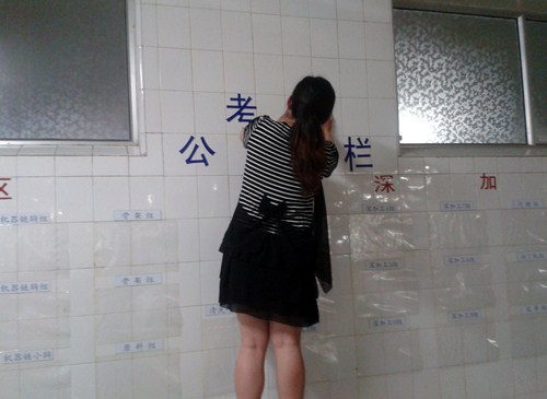 你往走廊这面大墙上张贴装考勤的袋子,我来接开双面胶;你往墙上张贴班组名称的标识牌,我来抹玻璃胶;大家互帮互助,各尽其职,忙得不亦乎!