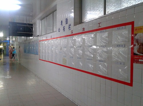 看着焕然一新的考勤张贴栏,我们露出了会心的微笑!使宽敞明亮的走廊增添一份异样美丽!考勤公布栏做到考勤的“公平、公正、公开”,让员工们明明白白了解自己每天的收入,增强员工的凝聚力,加强员工的干劲,为公司提升更高效率!