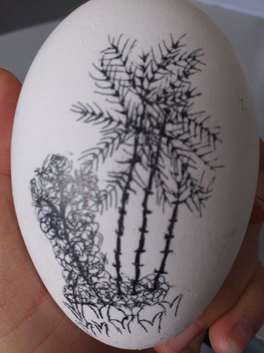 今天得到一枚大雁蛋, 午休时,把雁蛋拿在手中把玩。除了大一号,外表看来和鸭蛋、鹅蛋很相似呢;想来在这白白的雁蛋上作画,也许会别有一番趣味,于是乎动手,涂鸦。