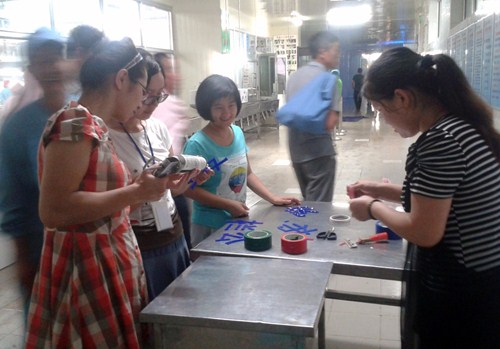 在忙碌中,也闹出了不少笑话,说来与大家同乐!在往墙上贴“屠宰区”的区字时,因一时大意,贴反了框,却没人发现;同时“区”里面的“乂”因贴反了玻璃胶,在张贴时“上、下、左、右”各摆了一遍,却怎么看也是越看越不像,大家你一言我一语“应先撇后捺,你看这样不对,捺小了”,原来“乂”的胶抹反了,大家这时都笑了。真是书到用时方恨少,古人造字真是神奇啊!