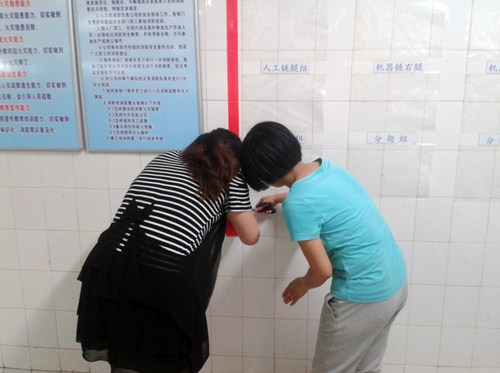 你往走廊这面大墙上张贴装考勤的袋子,我来接开双面胶;你往墙上张贴班组名称的标识牌,我来抹玻璃胶;大家互帮互助,各尽其职,忙得不亦乎!