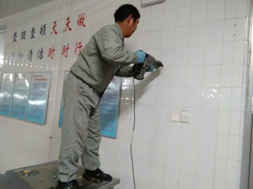 老王师傅先把牌子卸下来,将螺丝钉一一收起来装进口袋,这些个还能用。趁我收拾的空儿,他又将其他用具准备妥当,待牛海波工程师给插好电,老王师傅便自顾自的干起来。钻眼、钉木头、拧螺丝一切按部就班,我在下边帮托着牌子。每个牌子拧上螺丝后,老王师傅便后退步看看歪不歪。牌子间竖穿过一根套线管,两边的牌子跟管的距离都要一样宽。我由衷的夸了一句:老王师傅,您干活可真仔细。“干活就得这样” 老王师傅“没领情”,“特别给厂务干活,更得仔细,别让领导‘批你’,哈哈”。老王师傅幽默的损了我一下,却感动的我一塌糊涂。